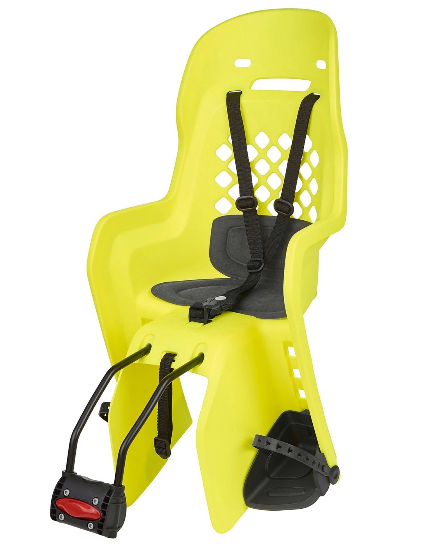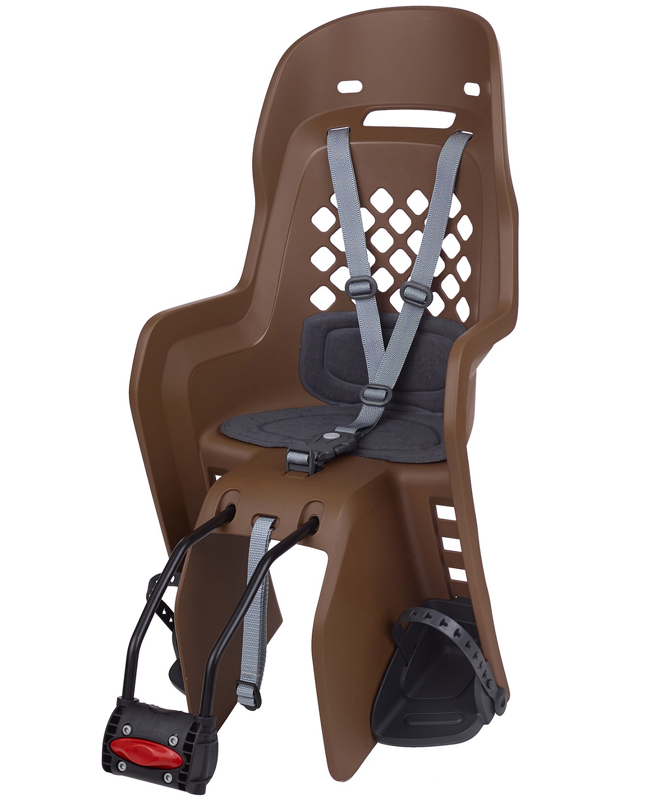 На кресле установлены 3 точечных ремня безопасности с возможностью регулировки по высоте, регулируемые в 4-х положениях подставки для ног и большую моющаяся подушку, а также на нем предусмотрены удобные подлокотники. Кресло можно без проблем перемещать вперед и назад в 3-х доступных положениях, регулируя его под рост ребенка и размеры велосипеда.
