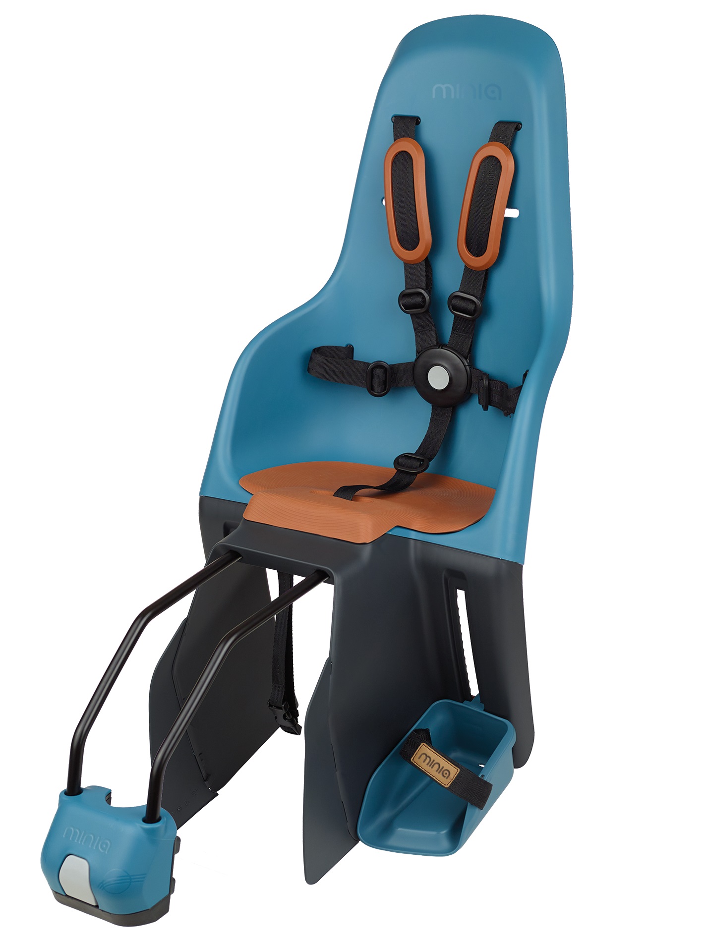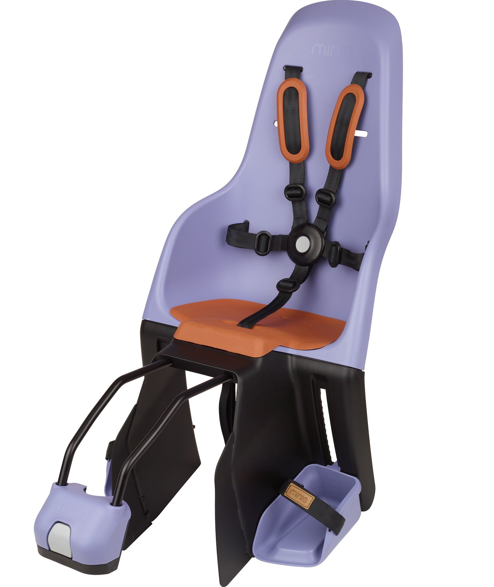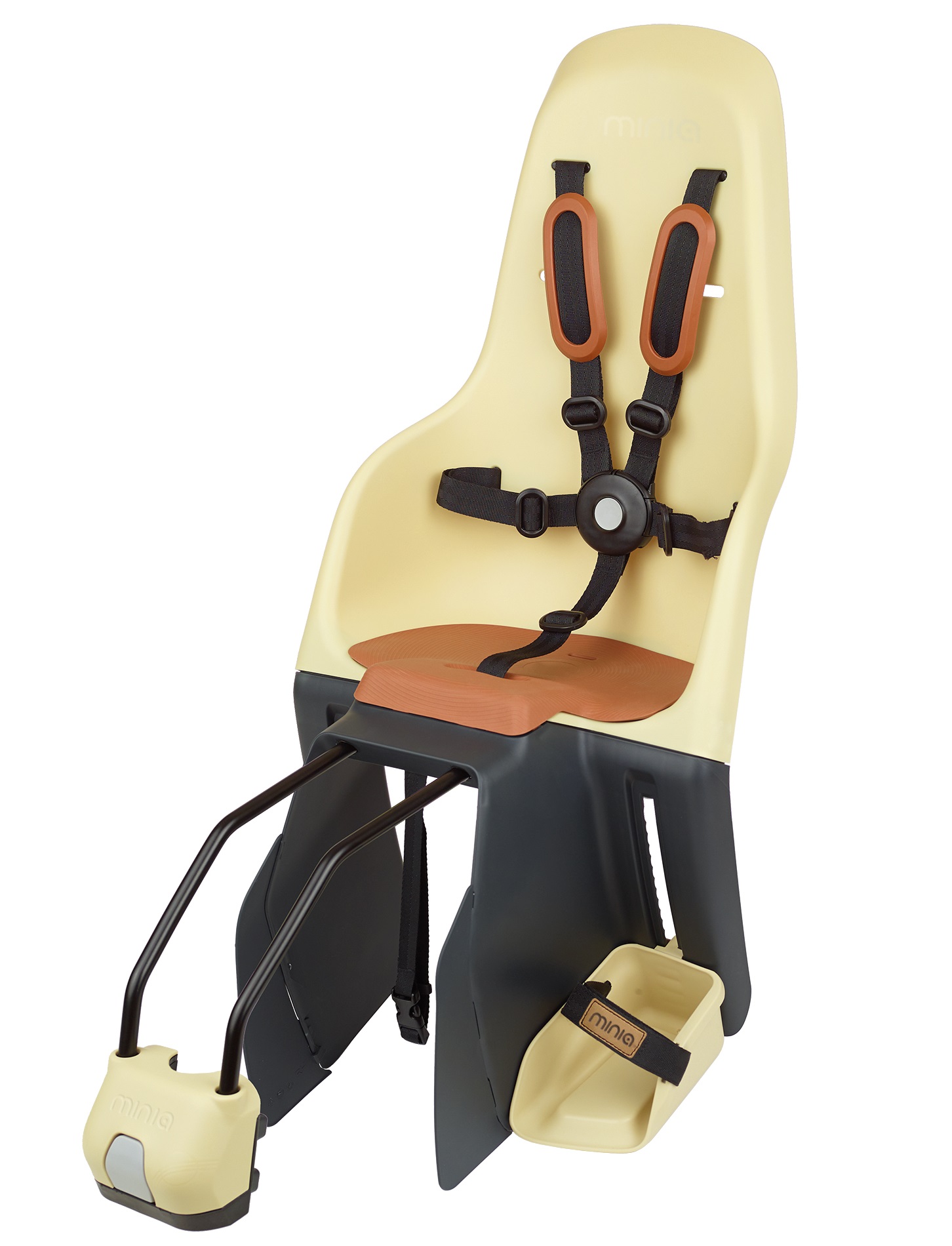 СИСТЕМА РЕМНЯ: Пятиточечные ремни безопасности состоят из пяти (двух плечевых, двух боковых и одного нижнего), которые соединяются в безопасную для детей пряжку, для расстегивания которой потребуется нажатие обеими руками. Встроенные в Minia защитные приспособления для ног надежно защищают ноги маленьких детей от заднего колеса.