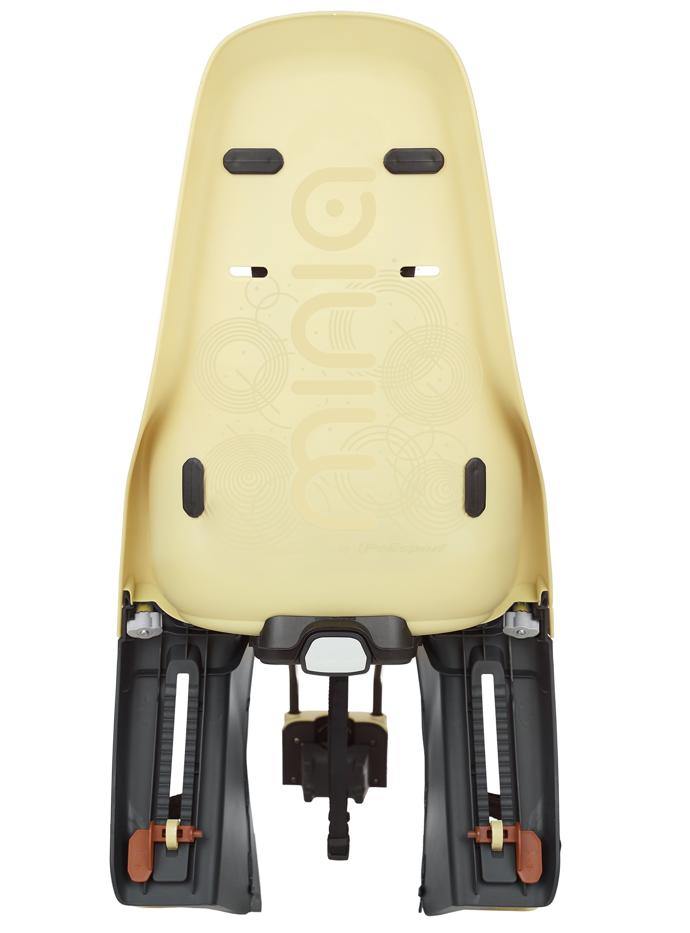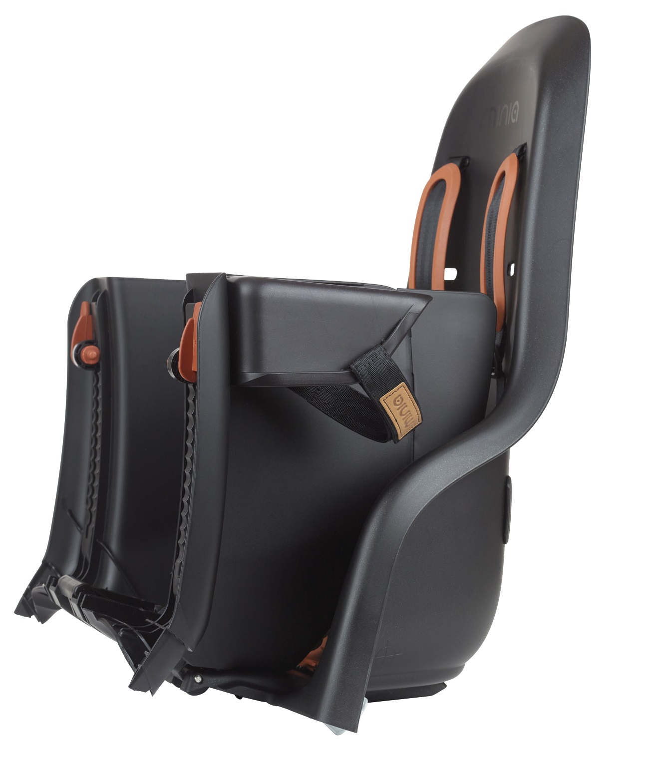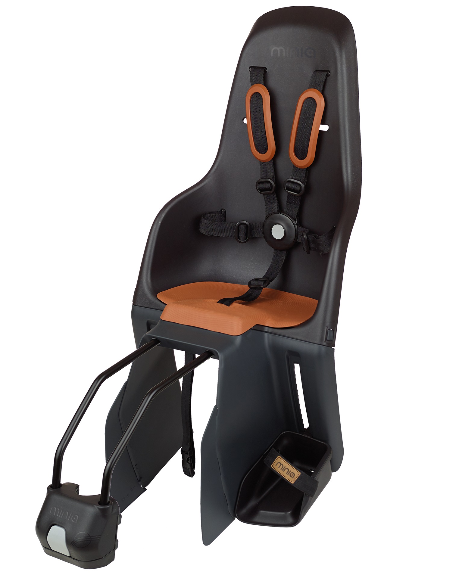 СИСТЕМА РЕМНЯ: Пятиточечные ремни безопасности состоят из пяти (двух плечевых, двух боковых и одного нижнего), которые соединяются в безопасную для детей пряжку, для расстегивания которой потребуется нажатие обеими руками. Встроенные в Minia защитные приспособления для ног надежно защищают ноги маленьких детей от заднего колеса.