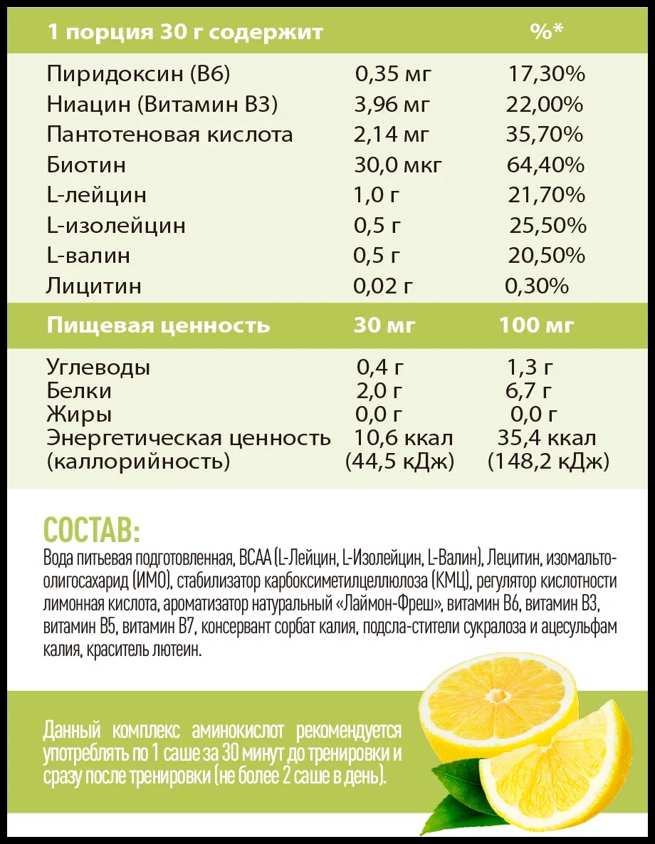 Состав: Вода питьевая подготовленная, BCAA (L-Лейцин, L-Изолейцин, L-Валин), Лецитин, изомальтоолигосахарид (ИМО), стабилизатор карбоксиметилцеллюлоза (КМЦ), регулятор кислотности лимонная кислота, ароматизатор натуральный "Лаймон-Фреш", витамин В6, витамин В3, витамин В5, витамин В7, консервант сорбат калия, подсластители сукралоза и ацесульфам калия, краситель лютеин.