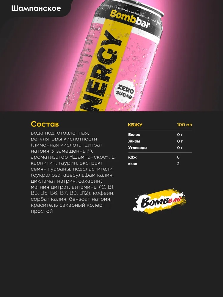 Состав: вода подготовленная, регуляторы кислотности (лимонная кислота, цитрат натрия 3-замещенный), ароматизатор «Шампанское», L-карнитин, таурин, экстракт семян гуараны, подсластители (сукралоза, ацесульфам калия, цикламат натрия, сахарин), магния цитрат, витамины (С, В1, В3, В5, В6, В7, В9, В12), кофеин, сорбат калия, бензоат натрия, краситель сахарный колер I простой.