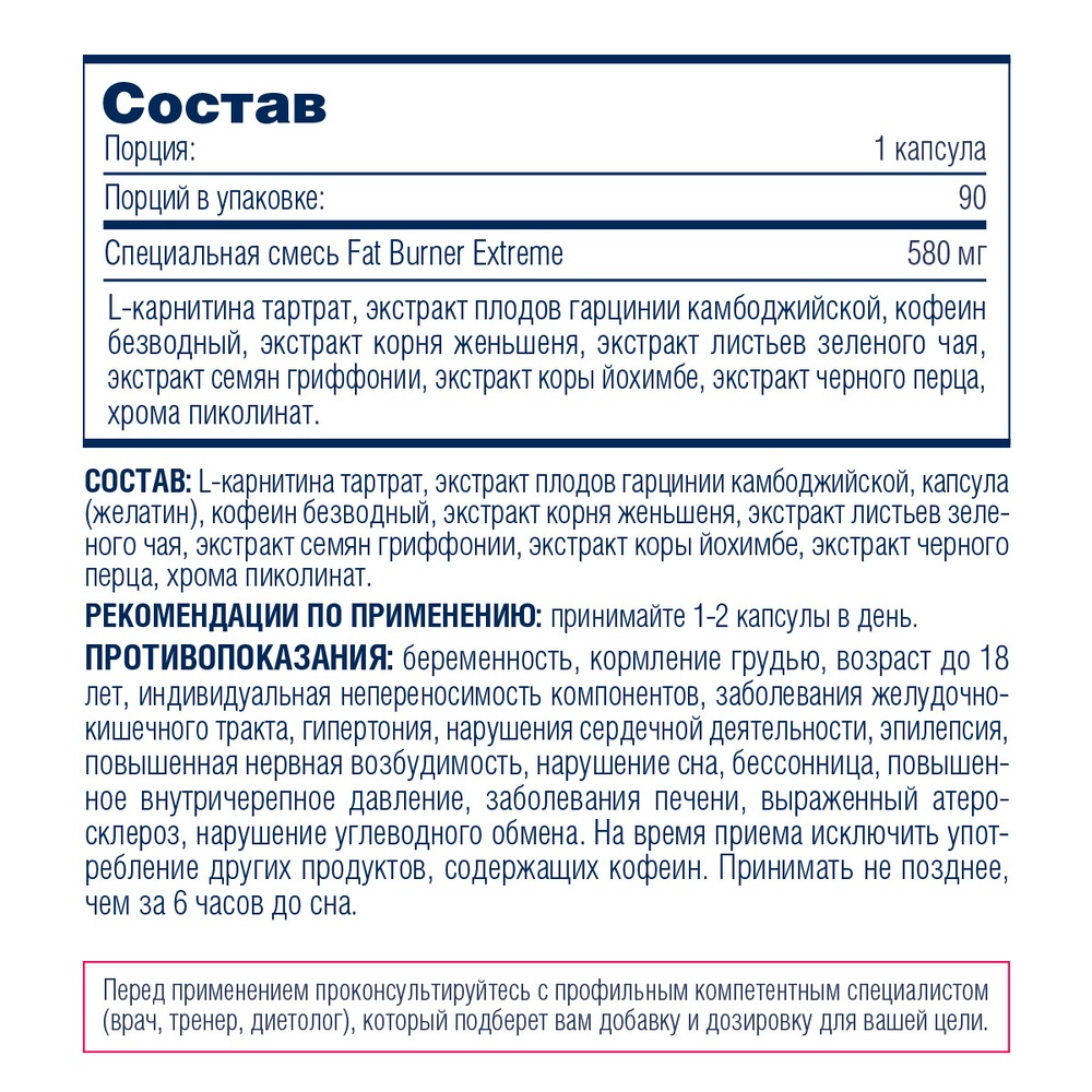 Состав Fat Burner Extreme: кофеин безводный, л-карнитин тартрат, экстракт гриффонии, экстракт гарцинии камбоджийской, экстракт зеленого чая, экстракт женьшеня, экстракт коры йохимбе, экстракт черного перца, пиколинат хрома.